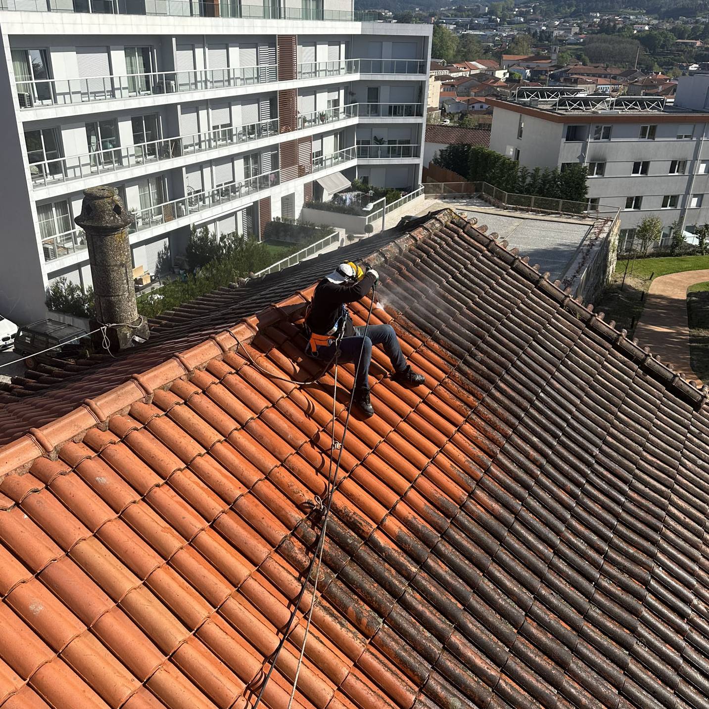 Com o tempo, os telhados acumulam musgo, sujidade e resíduos que podem comprometer a sua estrutura e impermeabilidade. Realizamos uma limpeza profunda, removemos os detritos e aplicamos produtos que ajudam a prevenir o crescimento de fungos e musgo, prolongando a vida útil do telhado e garantindo também um melhor escoamento da água da chuva.